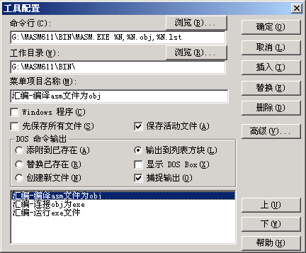 一共是三个命令,“汇编-编译asm文件为obj”按上边的设置,“汇编-连接obj为exe”呢,命令行是“G:\MASM611\BIN\LINK.EXE %N.obj;”,工作目录是“G:\MASM611\BIN\”,“汇编-运行exe文件”呢,工作目录和上边一样子,命令行是“%N.exe”